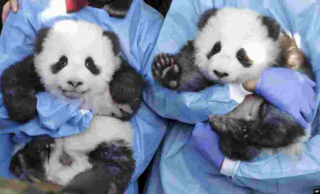 Zookeeper hold 'Meng Yuan' and 'Meng Xiang' during a name-giving event for the young panda twins at the Berlin Zoo in Berlin, Germany.