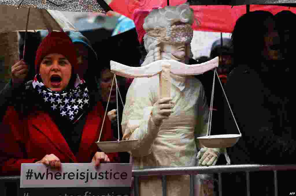 A woman dressed as Lady Justice joins over 100 protesters, many of them women, at a rally in heavy rain outside of the offices of Democratic Senators Chuck Schumer and Kirsten Gillibrand to demand that they hold up the nomination process of President Donald Trump's cabinet choices, in New York City.