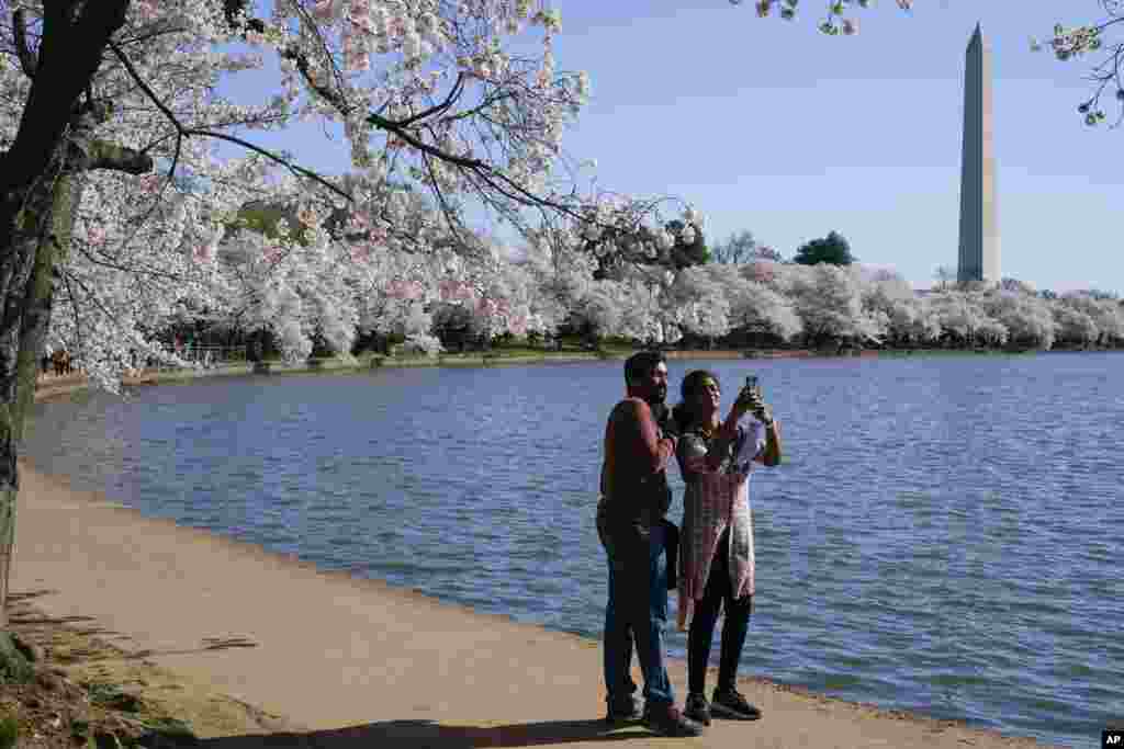 A man and a woman take a selfie under blooming Yoshino cherry trees on the edge of the Tidal Basin in Washington, D.C.