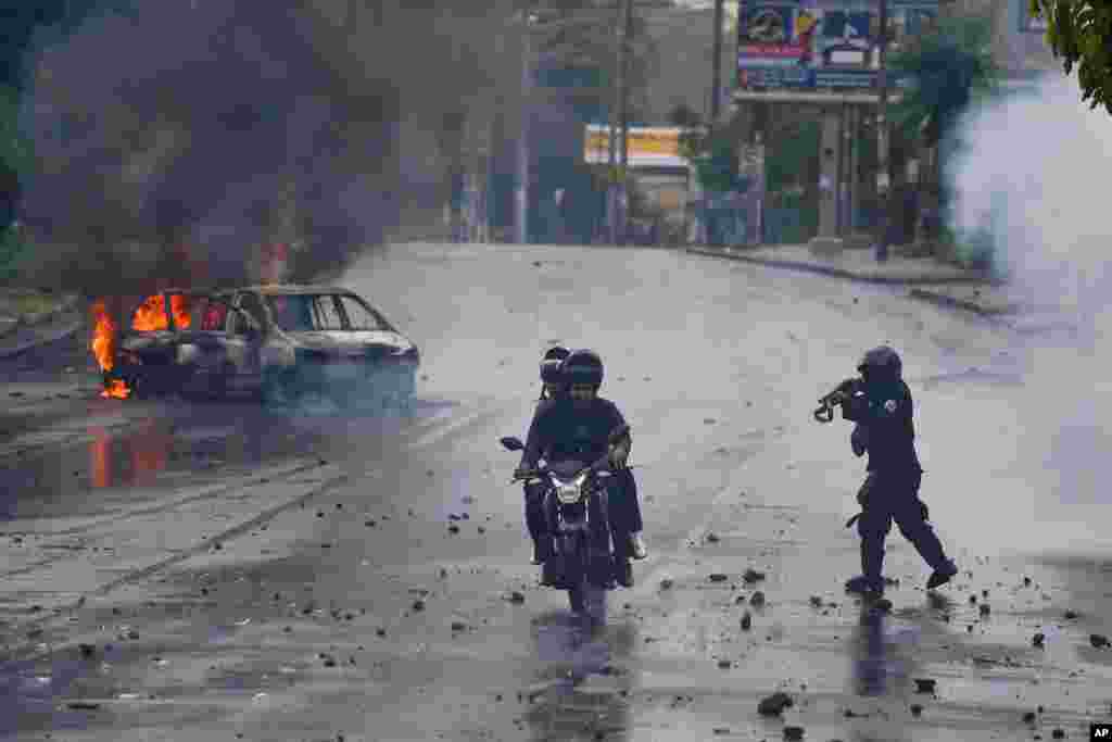 A police officer aims his shotgun at two men riding a motorcycle during a protest against Nicaragua's President Daniel Ortega, in Managua, Nicaragua, May 28, 2018. Violence returned to Nicaragua when riot police confronted protesters, and students seized a university.