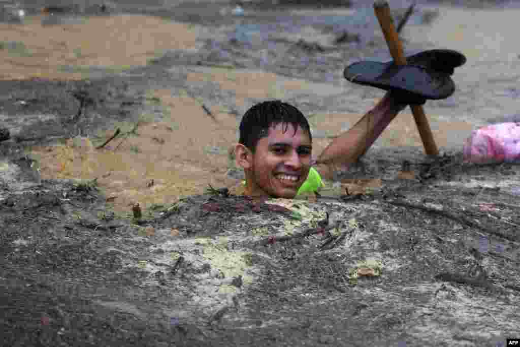 A man wades through flood waters in the Alemania suburb, which was flooded by the overflow of the La Arenera stream, due to the heavy rains caused by Hurricane Eta, in El Progreso, 260 kms north of Tegucigalpa, Honduras, Nov. 4, 2020.