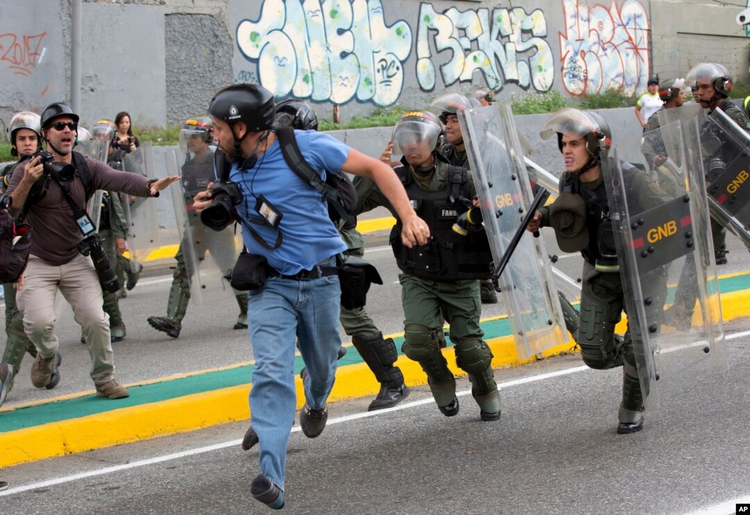 Reuters photojournalist Marco Bello runs as Venezuelan National Guard soldiers chase him during a protest outside the Supreme Court in Caracas. Security forces violently repressed small protests that broke out in the city after the government-stacked Supreme Court gutted congress of its last vestiges of power, drawing widespread condemnation from foreign governments.