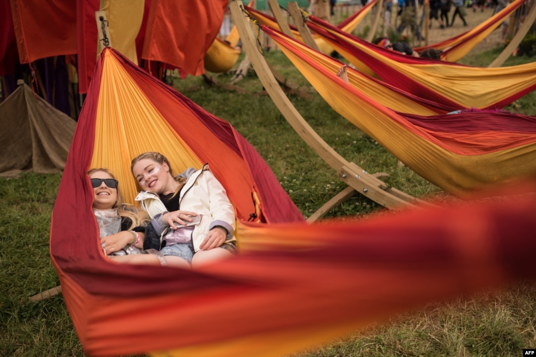 Festival-goers relax in a hammock at the Glastonbury Festival of Music and Performing Arts on Worthy Farm near the village of Pilton in Somerset, south-west England.